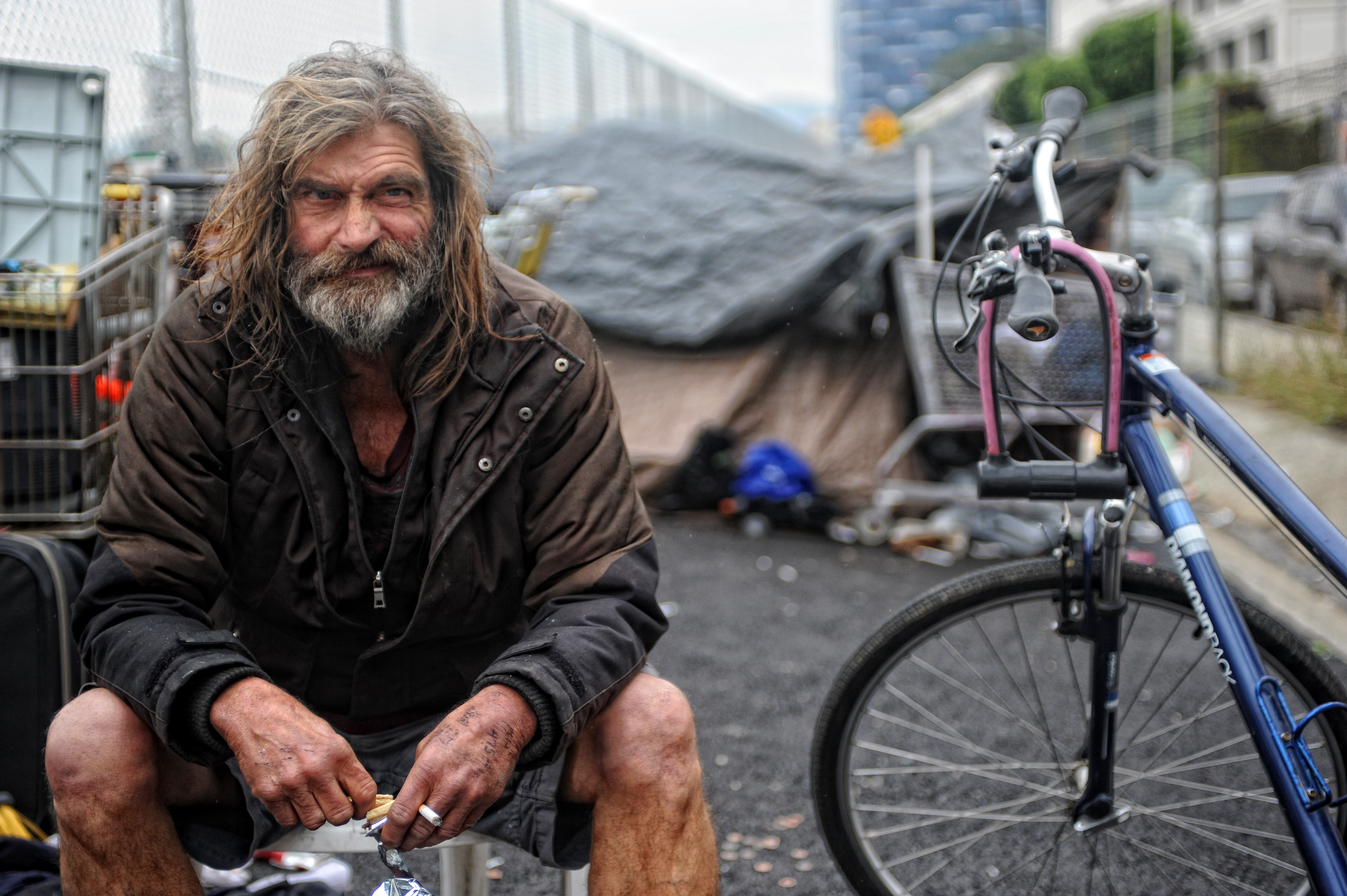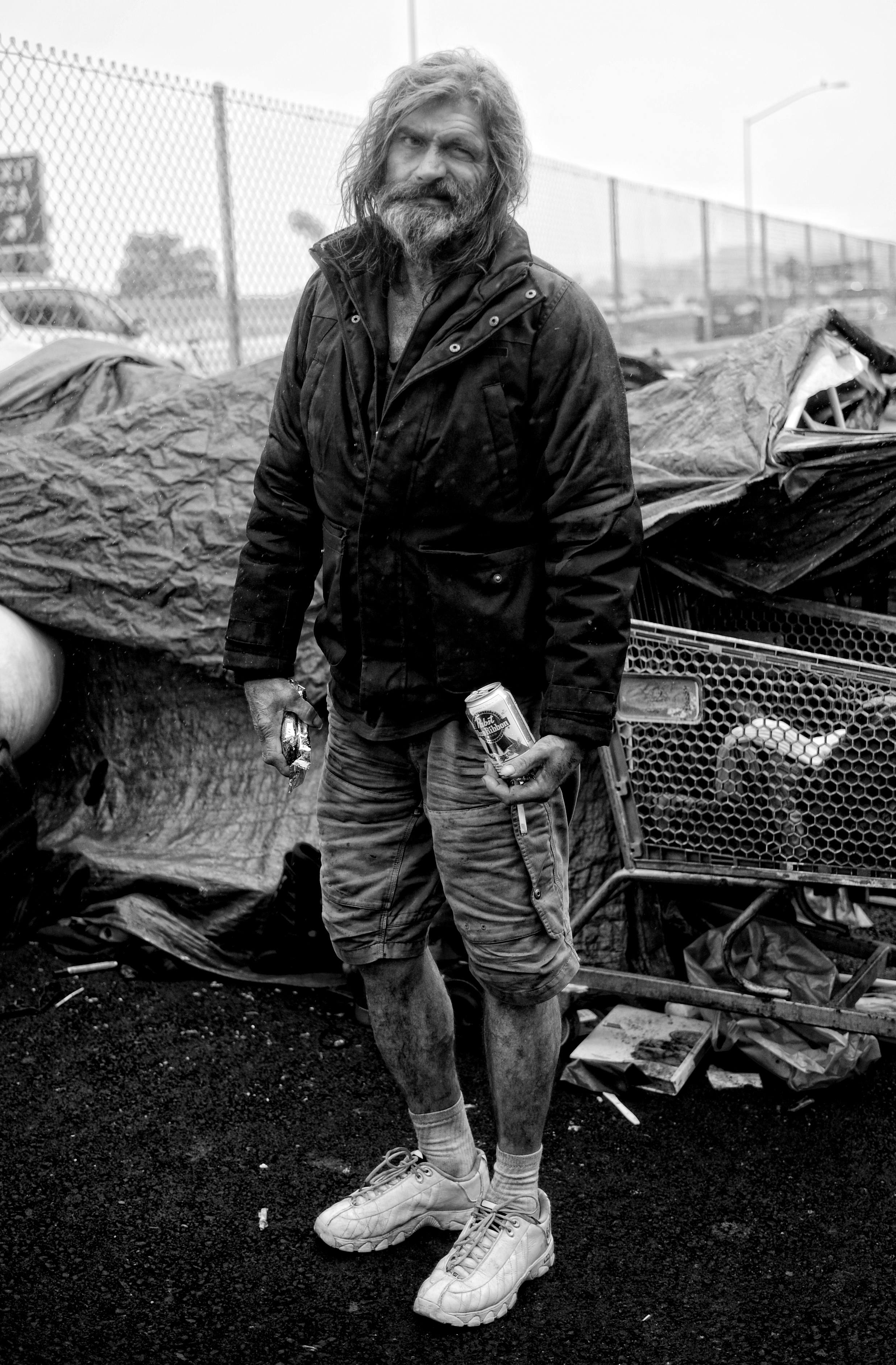 A 3 foot cement barrier and chain link fence is all that seperates this man from life and a certain death. For the past 4 months, Aldrich has lived on the side of the 405 freeway. Tens of thousands of unsuspecting motorists pass him each day. He lives in a makeshift home made up of various boxes and plastic tarps.