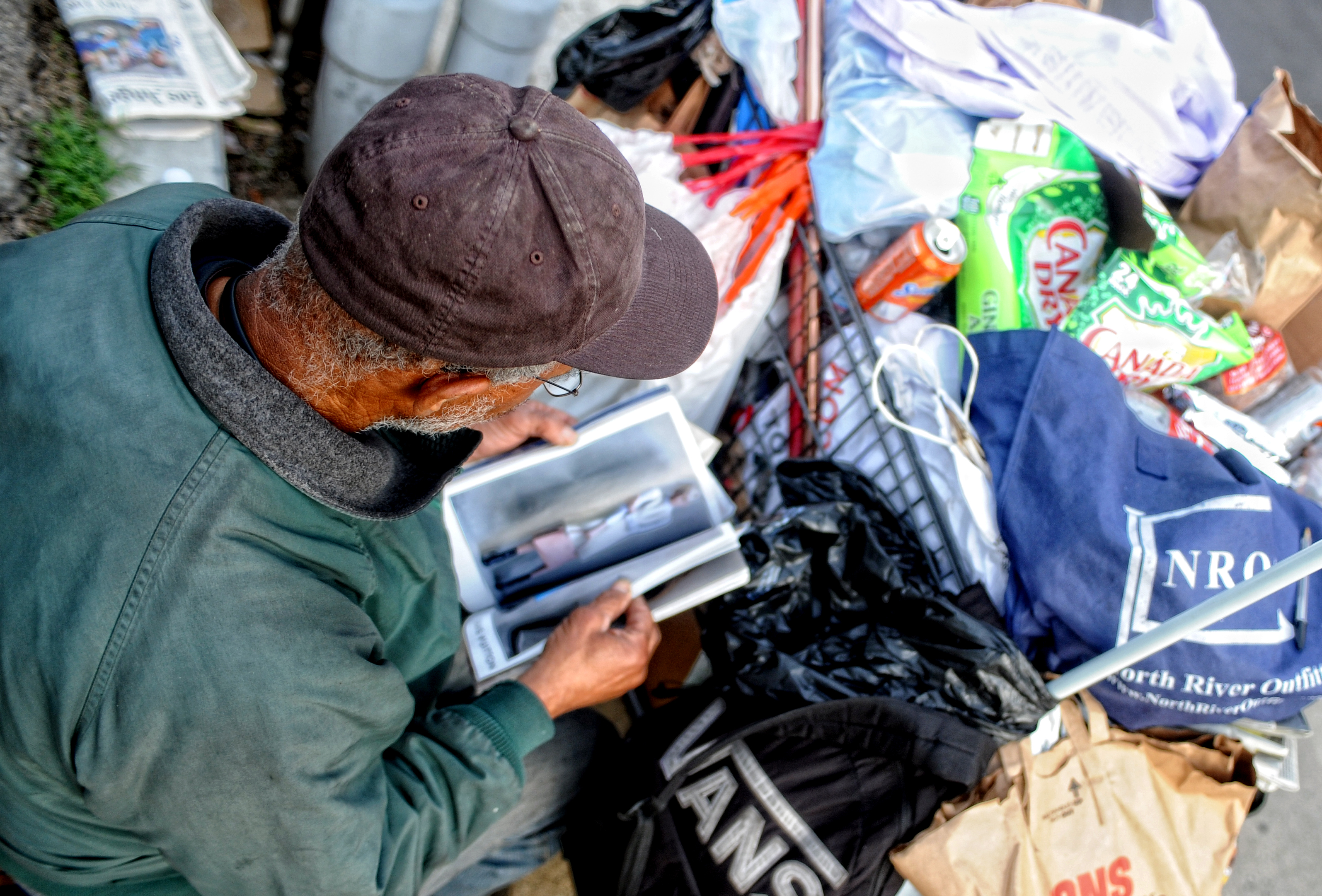 He surrounds himself with discarded daily newspapers and magazines and spends his days reading and catching up on the happenings around the world. From the Oliver North scandal to today’s Hollywood stories, he knows of it all and most of the apparent lies being told.
