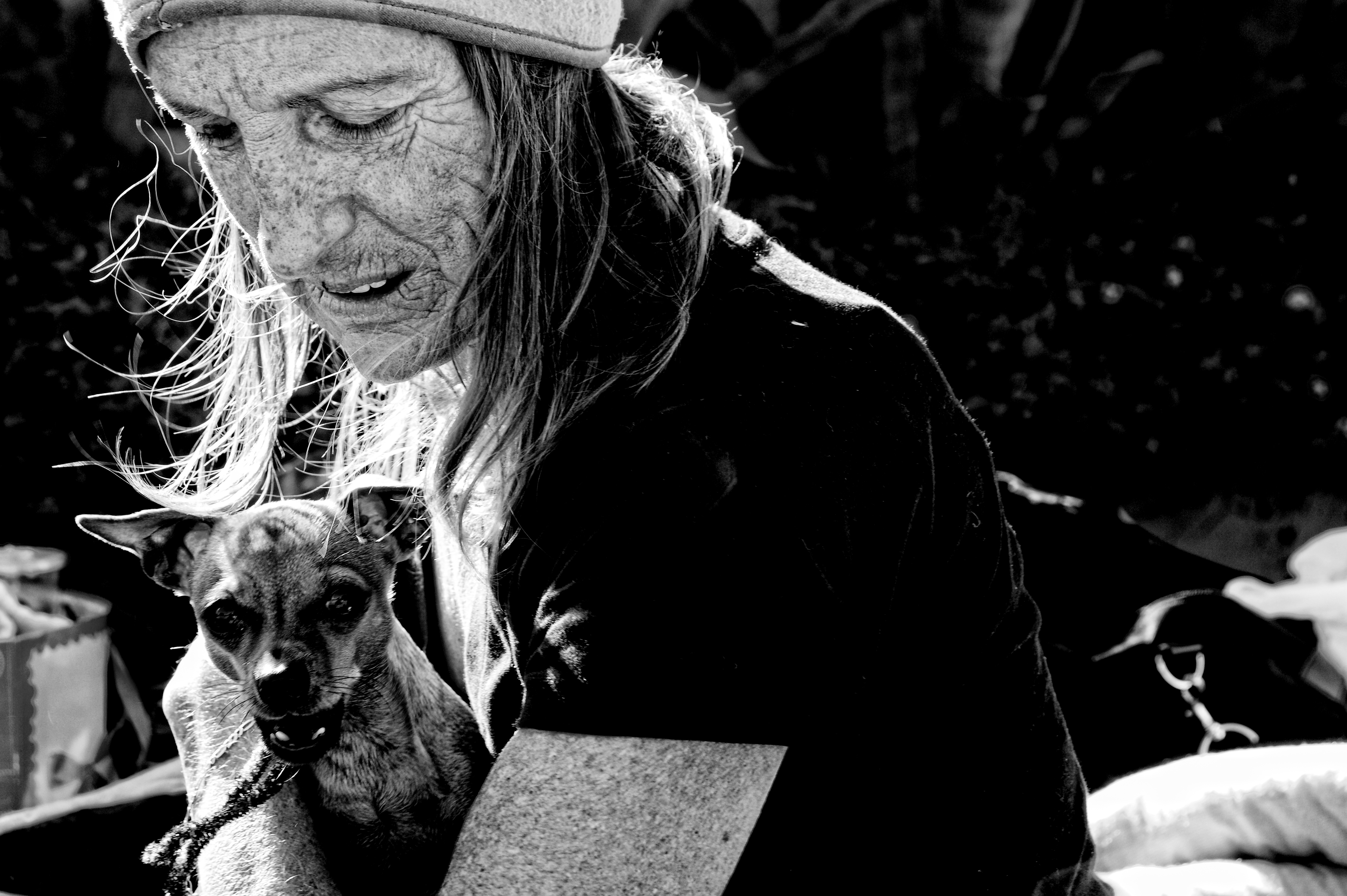 Sitting here on the sidewalk with all of her worldly possessions, she cradles the one thing that keeps her happy and content, Beaslow, a one year old German Shepard and Papillon mix. Their love for each other is abundant.