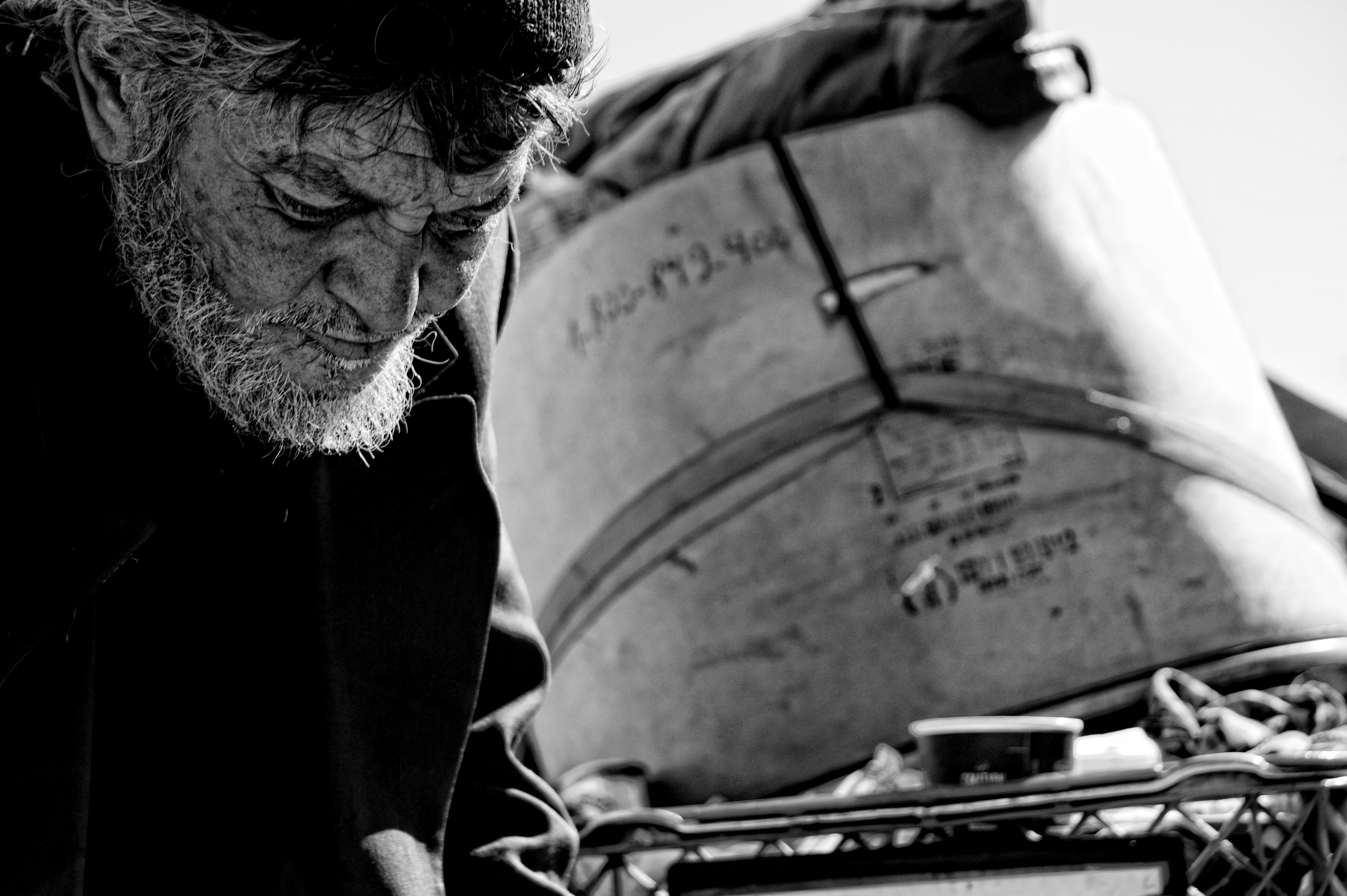 Born in 1954 in Romania he moved to Los Angeles in 1981. Claiming he was sponsored by a Romanian Culture Group, he know not how to get in touch with them today and is living on the streets. He admits he is doing o.k. for today, and that he works a few various jobs to get by. He points out two buildings, and shows me where he sometimes labors for food for the past 20 years.